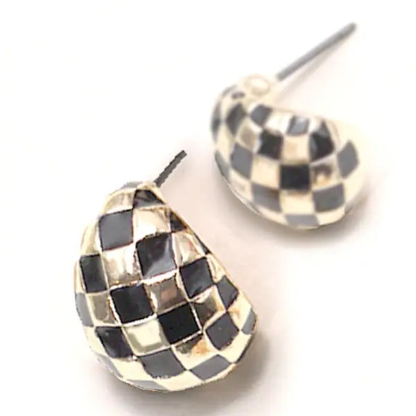 These earrings feature a distinctive half-moon shape adorned with a chic checker pattern, adding a touch of modern flair to your ensemble.