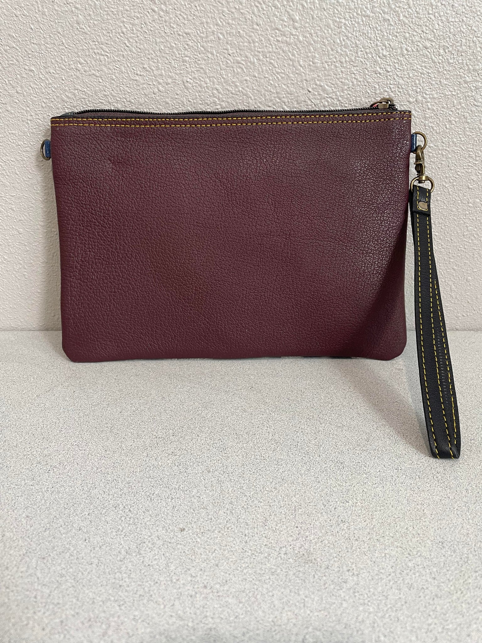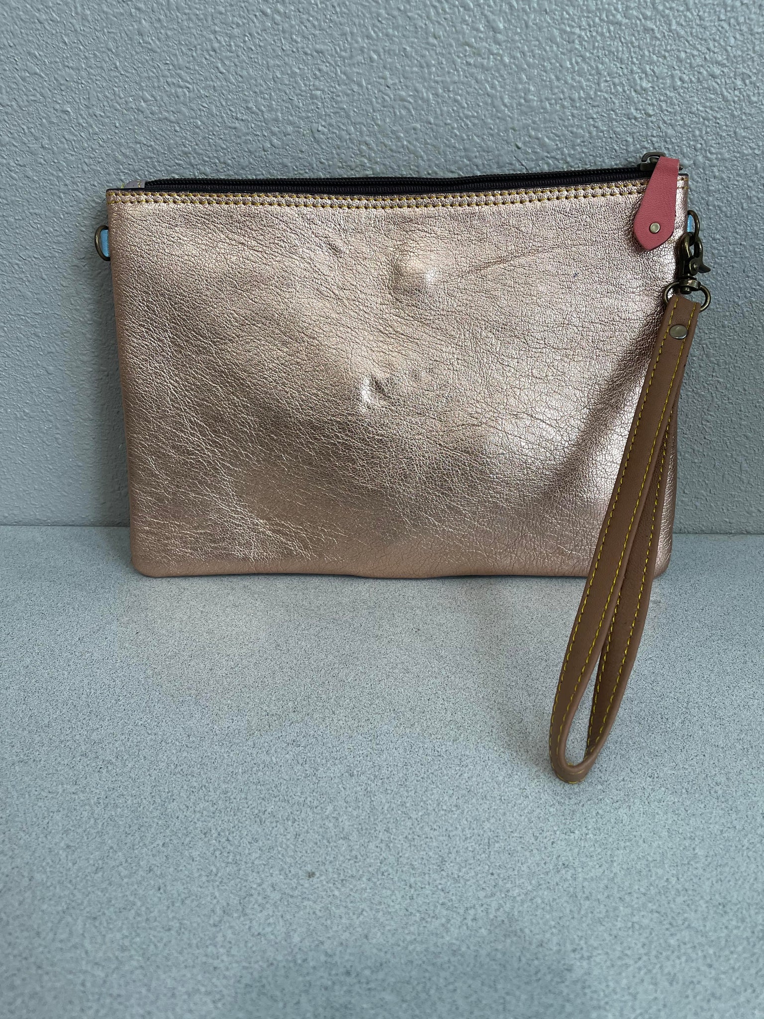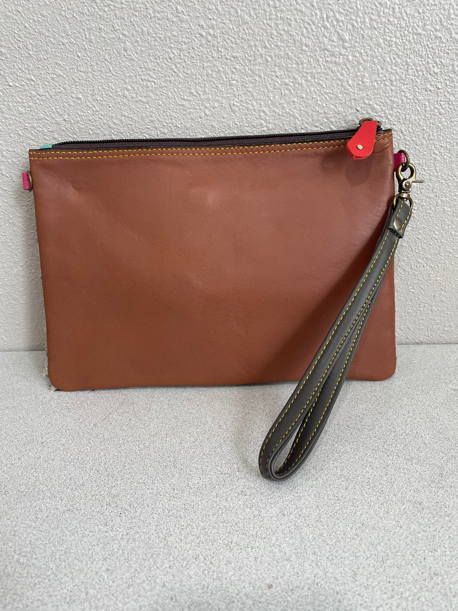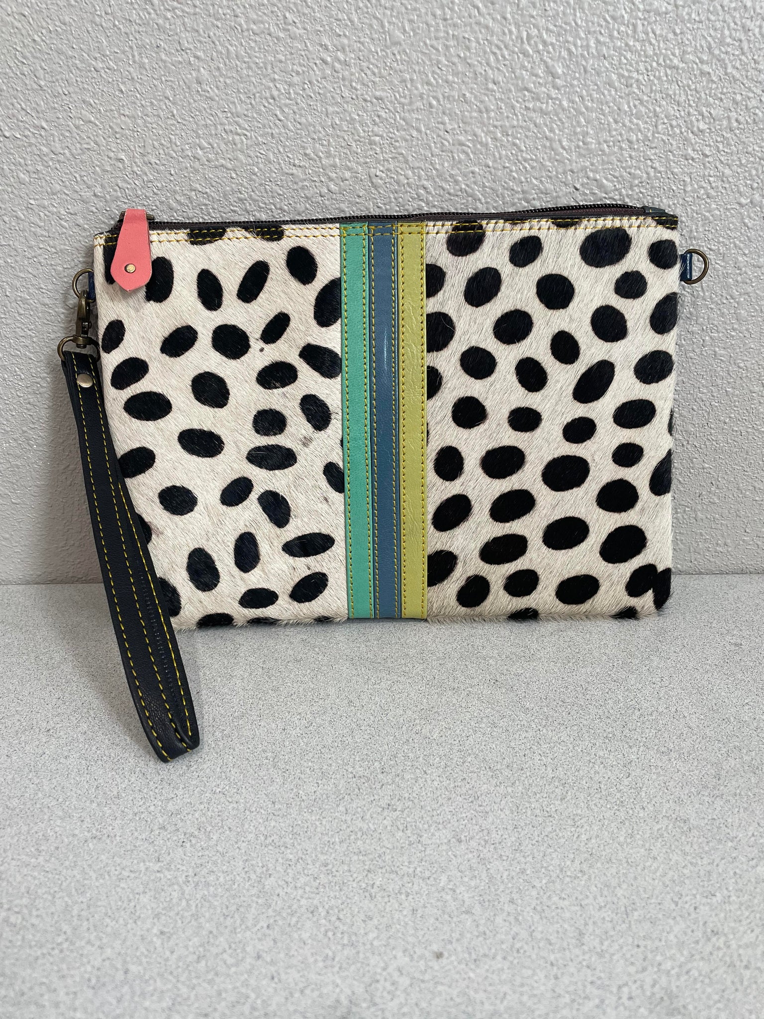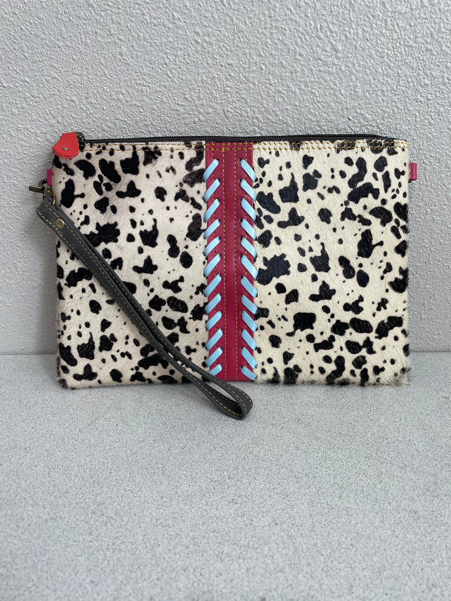 Genuine leather featuring hair on hide detailing. The Everly bag features a wristlet strap, zipper closure and small zipper closure inside. The bag also comes with a crossbody strap.