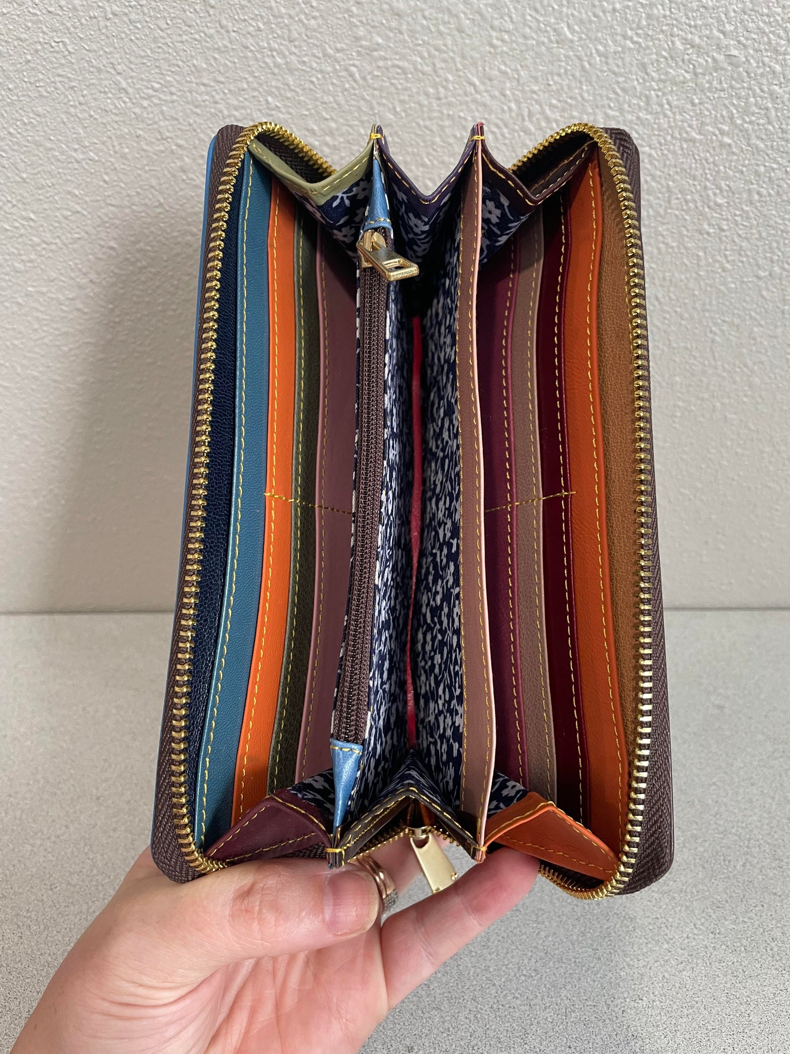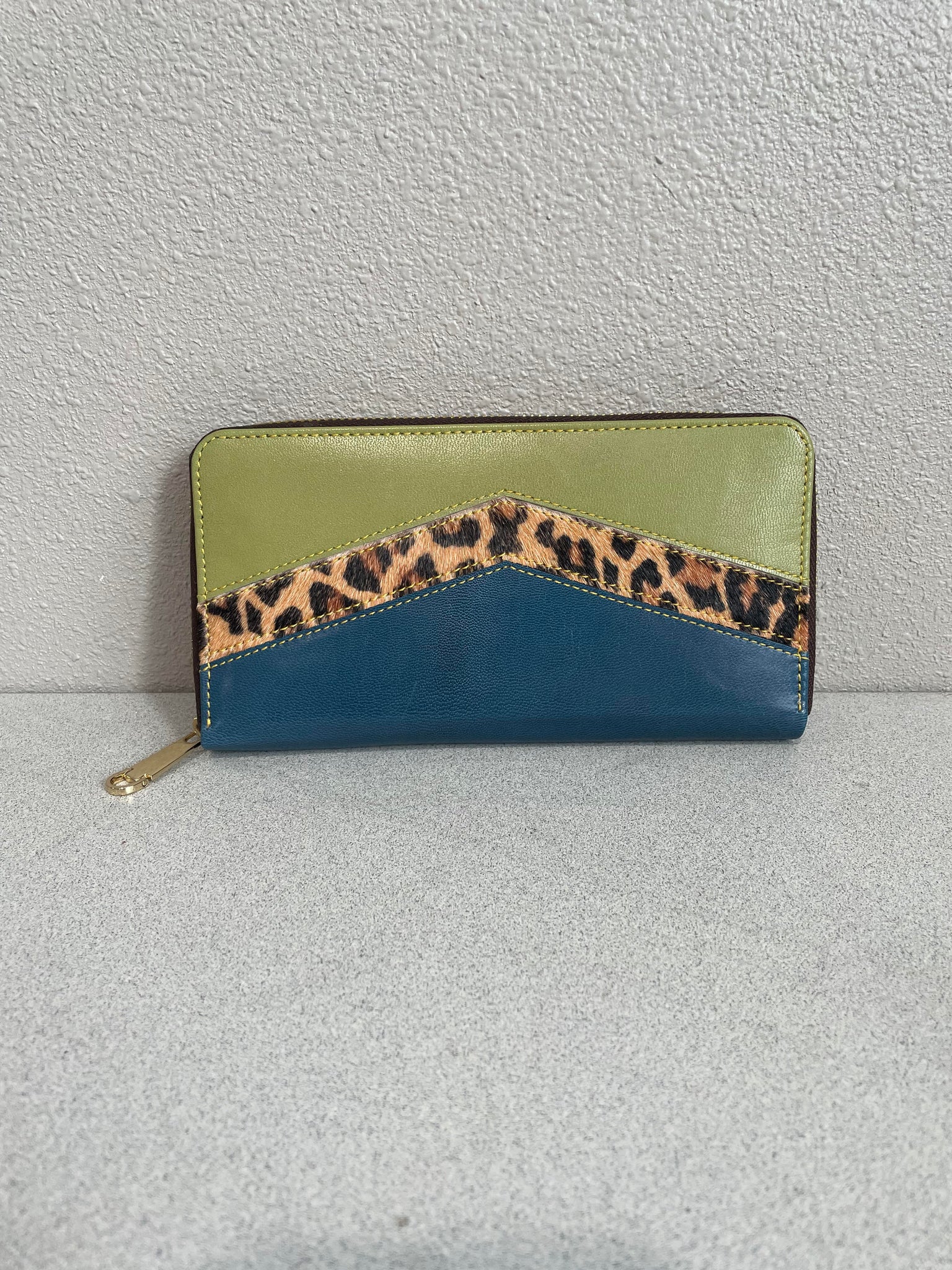 Genuine leather featuring hair on hide detailing. The Gia wallet features several pockets with an outside zipper closure and a zipper closure inside.